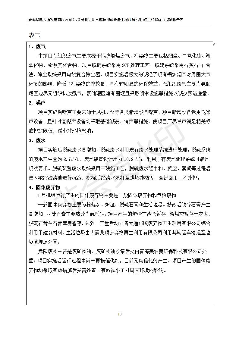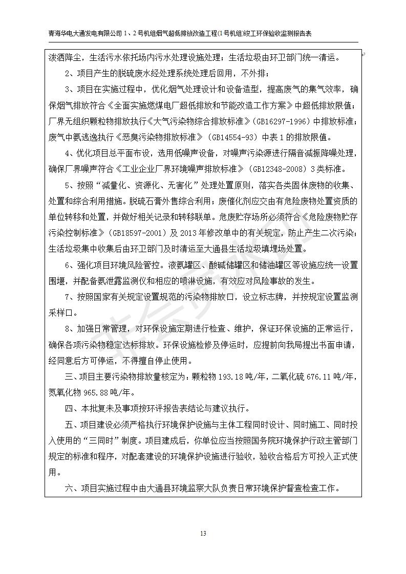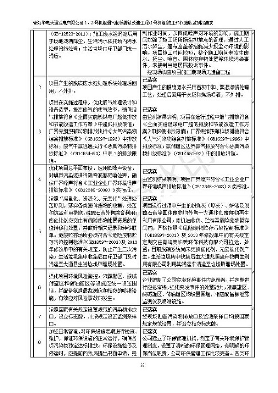 根據(jù)中華人民共和國(guó)國(guó)務(wù)院令第682號(hào)《國(guó)務(wù)院關(guān)于修改〈建設(shè)項(xiàng)目環(huán)境保護(hù)管理?xiàng)l例〉的決定》和《建設(shè)項(xiàng)目竣工環(huán)境保護(hù)驗(yàn)收暫行辦法》(國(guó)務(wù)院令682號(hào)),青海華電大通發(fā)電有限公司1、2號(hào)機(jī)組煙氣超低排放改造工程(1號(hào)機(jī)組) (包括竣工環(huán)境保護(hù)驗(yàn)收監(jiān)測(cè)報(bào)告表和驗(yàn)收意見)公示如下。 一、項(xiàng)目名稱:青海華電大通發(fā)電有限公司1、2號(hào)機(jī)組煙氣超低排放改造工程(1號(hào)機(jī)組) 竣工環(huán)境保護(hù)驗(yàn)收監(jiān)測(cè)報(bào)告表 二、地點(diǎn):青海省西寧市大通縣寧張公路31公里處 三、建設(shè)單位:青海華電大通發(fā)電有限公司 四、建設(shè)內(nèi)容:1號(hào)機(jī)組煙氣超低排放改造,1號(hào)機(jī)組改造內(nèi)容為脫硫系統(tǒng)保留原脫硫裝置作為一級(jí)塔,新建二級(jí)合金托盤塔串聯(lián)吸收塔;對(duì)原“1+2”電袋復(fù)合除塵器的一電場(chǎng)電源進(jìn)行改造,對(duì)布袋除塵器濾袋進(jìn)行更換;對(duì)原脫硝系統(tǒng)選擇性催化還原法(SCR)脫硝工藝加裝備用催化劑,每層催化劑增加聲波吹灰器,優(yōu)化SCR反應(yīng)器入口導(dǎo)流板。 五、聯(lián)系人:張工 六、聯(lián)系電 話:0971-6515411 七、公示時(shí)間:二〇一九年二月十三日至二〇一九年三月十二日 公示期間,對(duì)上述公示內(nèi)容如有異議,請(qǐng)以書面形式反饋,個(gè)人須署真實(shí)姓名,單位須加蓋公章。