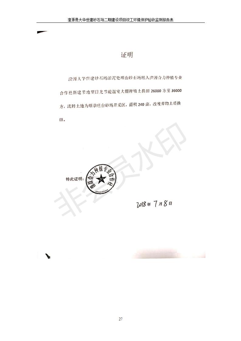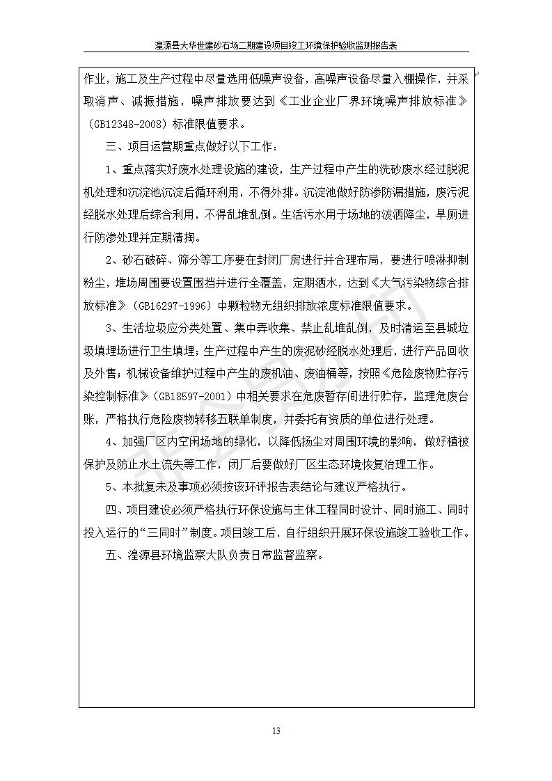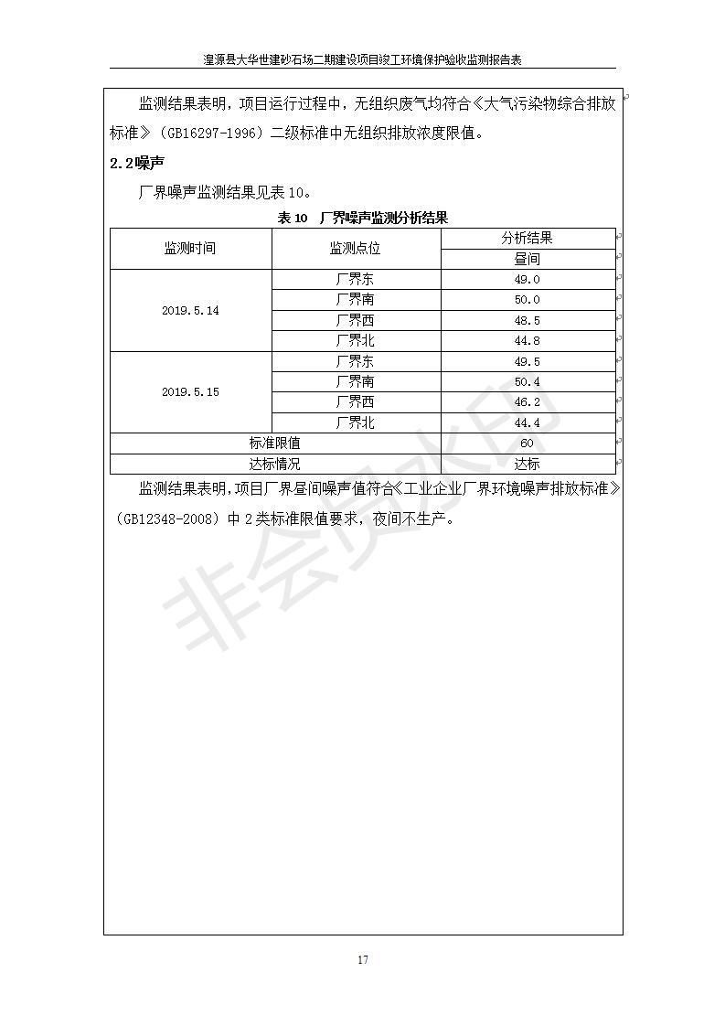 根據(jù)中華人民共和國國務(wù)院令第682號《國務(wù)院關(guān)于修改〈建設(shè)項(xiàng)目環(huán)境保護(hù)管理?xiàng)l例〉的決定》和《建設(shè)項(xiàng)目竣工環(huán)境保護(hù)驗(yàn)收暫行辦法》(國務(wù)院令682號),湟源大華世建砂石場湟源縣大華世建砂石場二期建設(shè)項(xiàng)目(包括竣工環(huán)境保護(hù)驗(yàn)收監(jiān)測報(bào)告表和驗(yàn)收意見)公示如下。 一、項(xiàng)目名稱:湟源縣大華世建砂石場二期建設(shè)項(xiàng)目 二、地點(diǎn):湟源縣申中鄉(xiāng)窯莊村沙崗大小灣 三、建設(shè)單位:湟源大華世建砂石場 四、建設(shè)內(nèi)容:項(xiàng)目主要建設(shè)砂石料產(chǎn)品加工生產(chǎn)區(qū)、原料堆場、產(chǎn)品堆場、辦公區(qū)等。五、聯(lián)系人:張工 六、聯(lián)系電 話:0971-6515411 七、公示時間:二〇一九年七月二十五日至二〇一九年八月二十一日公示期間,對上述公示內(nèi)容如有異議,請以書面形式反饋,個人須署真實(shí)姓名,單位須加蓋公章。