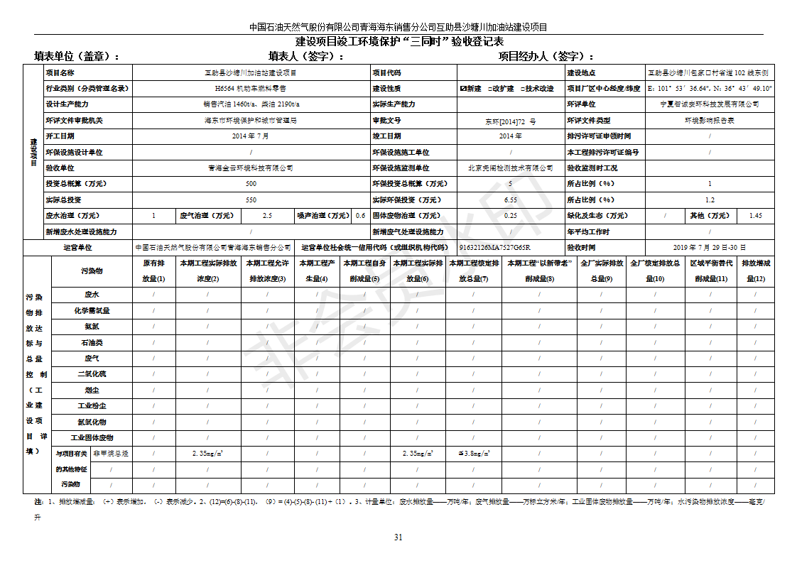 根據(jù)中華人民共和國國務(wù)院令第682號(hào)《國務(wù)院關(guān)于修改〈建設(shè)項(xiàng)目環(huán)境保護(hù)管理?xiàng)l例〉的決定》和《建設(shè)項(xiàng)目竣工環(huán)境保護(hù)驗(yàn)收暫行辦法》(國務(wù)院令682號(hào)),互助縣沙塘川加油站建設(shè)項(xiàng)目(包括竣工環(huán)境保護(hù)驗(yàn)收監(jiān)測報(bào)告表和驗(yàn)收意見)公示如下。 一、項(xiàng)目名稱:互助縣沙塘川加油站建設(shè)項(xiàng)目 二、地點(diǎn):互助縣塘川鎮(zhèn)包家口村 六、聯(lián)系電話:0971-6515411 七、公示時(shí)間:二〇一九年九月二十七日至二〇一九年十月二十九日 公示期間,對(duì)上述公示內(nèi)容如有異議,請(qǐng)以書面形式反饋,個(gè)人須署真實(shí)姓名,單位須加蓋公章。